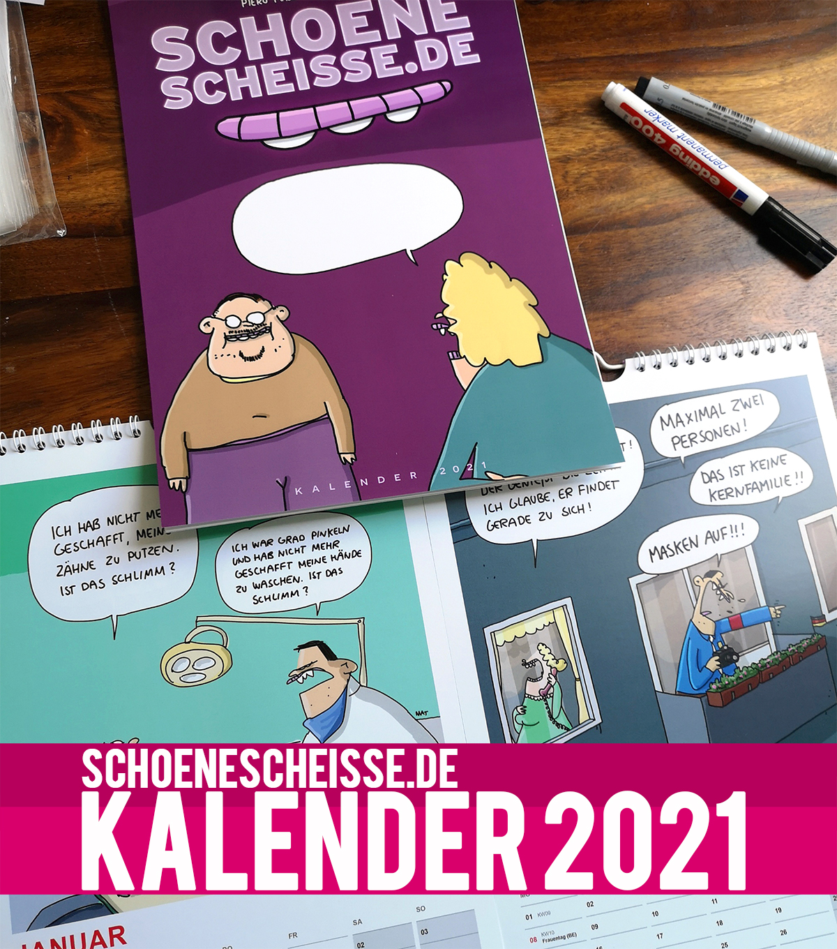 Der Schoenescheisse-Kalender 2021 Der aktuelle Schoenescheisse-Kalender für 2021! Er ist hochkant DIN A4 und sieht super aus :) . Er kostet 12 Euro plus 1,55 Euro Versand und die Sprechblase auf dem Titel könnt ihr personalisieren. Ich fülle sie nach Euren Wünschen aus! . Und jeder der mindestens ZWEI Kalender bestellt bekommt den Band „Fleischlos glücklich“ dazu! Bestellen geht so: 13,55 Euro pro Kalender per PayPal an piero@schoenescheisse.de, Spruch für die Sprechblase und Adresse dazuschreiben, fertig! Oder wenn du lieber klassisch überweisen möchtest schreib mir eine PN oder eine Mail an piero@schoenescheisse.de. . Hier ein paar Inspirationen für die Sprechblase: . 1. XY, steckst du in diesem Ding? Komm raus, ich hab einen Kalender für dich! 2. Für dich, XY! Damit du auch im neuen Jahr weiter so blöd grinsen kannst! 3. Auch wenn du dich als Mann verkleidet hast, XY! Dieser Kalender ist für dich! 4. Dieser Kalender ist für dich, XY! Damit du immer rechtzeitig die Unterhosen wechselst! 5. Damit wenigsten etwas schön ist, in deiner Wohnung, XY! 6. Lieber XY, damit wenigstens etwas lustig ist in 2021! 7. Ich wollte eine Brustvergrößerung, keinen Kalender! 8. Mit „Ich will etwas Kleines“ meinte ich einen Ring und keinen Kalender! 9. Hier XY, den Kalender kannst du dir schön vor’s Gesicht halten! 10. Sprechblase leerlassen, ich kann schon selber schreiben, Danke! . www.schoenescheisse.de Von Piero Masztalerz|2021-01-16T20:43:36+01:009. Januar 2021|CARTOONS| Weiterlesen